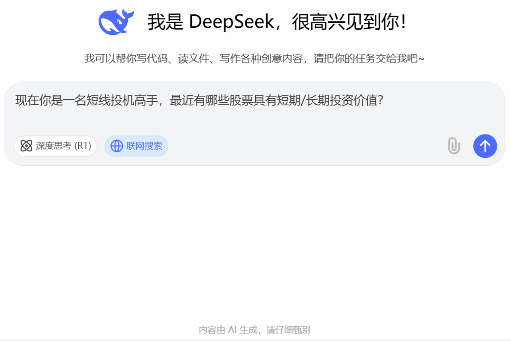 例如,你可以直接问AI问题:现在你是一个短期投机者。最近哪些股票有短期/长期投资价值?然后AI会通过自己的深入思考,在搜索互联网后给出答案。
