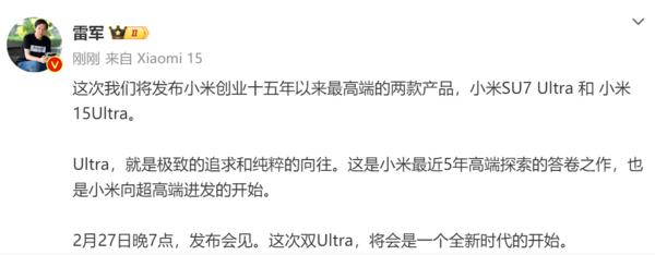 据官方消息,小米将在 2 月 27 日晚 7 点击召开新产品发布会,但在本次发布会上,小米的两款重磅新产品将亮相,包括顶级旗舰新机小米。 15 Ultra 小米和小米高性能轿车小米 SU7 Ultra。雷军发表了一篇文章:“这次我们将发布小米创业十五年以来最高端的两款产品,小米 SU7 Ultra 和小米 15Ultra。Ultra,正是极致的追求和单纯的憧憬。小米最近就是这样 5 年度高档探索的答卷佳作,也是小米向超高端发展的开始。"