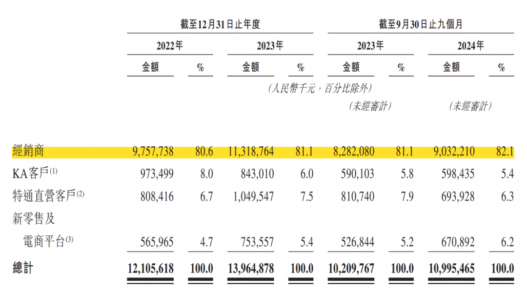 在这些经销商中,经销商一直是绝对的主力军,2022年、2023年和2024年第三季度,他们贡献了97.6亿元、113.2亿元和90.3亿元,占总收入的80%以上。截至去年第四季度,安井的经销商总数已达2069家。根据弗若斯特沙利文的说法,2023年,每个经销商的平均贡献收入约为580万元,超过了行业龙头企业的标准。