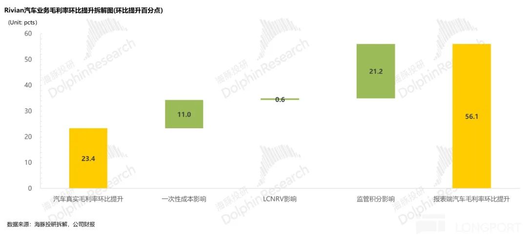 但 Rivian 事实上,汽车业务报表的毛利也受到库存和合同减值的冲回和一次性成本因素的影响,但由于库存和合同减值的冲回金额 2025 年份很少,而且一次性成本(主要和第二代) R1 更新相关费用)几乎没有 2025 年复一年,因此,为了观察持续性,海豚君消除了这两种影响,观察真正的汽车业务毛利率。