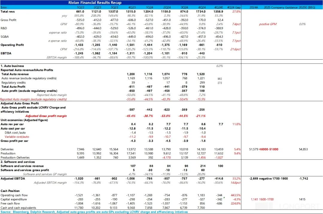 $Rivian.US 于 2025 年 2 月 20 之后日美股市公布 2024 年四 季度财务报告。看重要信息: