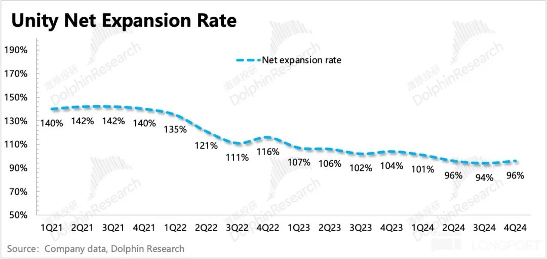 近一年净扩张率持续下降至 100% 下面,这个也应该包括老客户的不满。 Runtime 在不续签的情况下,收费模式。 Unity 与游戏客户的关系正在不断修复,而不是游戏行业的客户,第四季度订阅收入同比增长超过 50%,说明 Unity 6 尤其是在汽车、零售领域,需求旺盛。