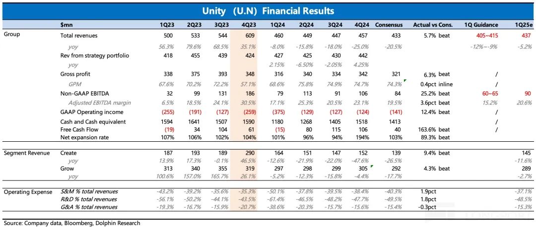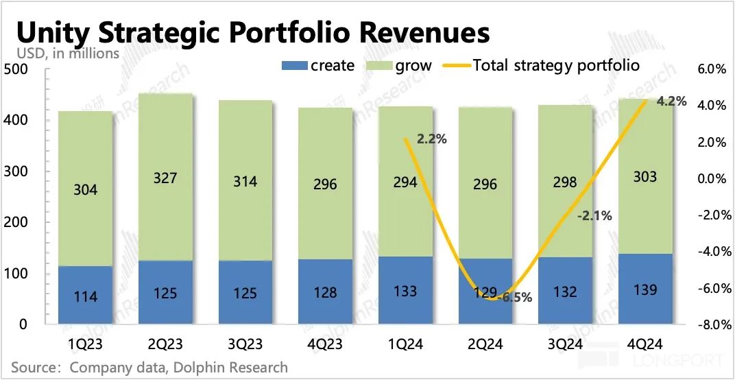 Unity 第四季度实现总收入 4.57 亿美元,同比下滑 25%,去除 Weta 剥离的影响,同比下降 20%,仍然在业务重组的影响周期之内。如果重组的影响完全消除,单从 Strategic Portfolio 看来,收入同比增长 4%,也明显超出了市场预期。
