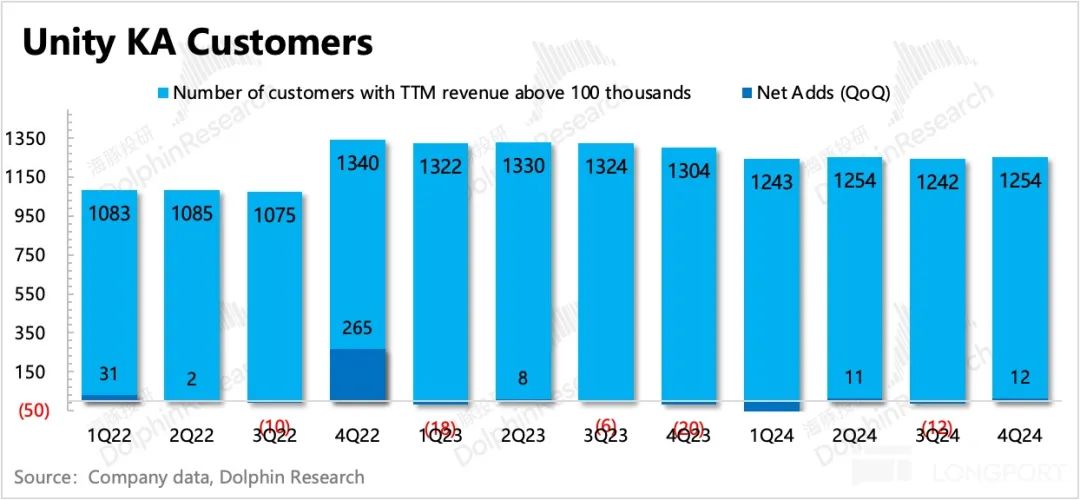 大客户数量一般为发动机业务用户(至少签字) 1 年),所以近一年的客户数量变化主要受业务重组的影响。比如原来的 Weta、专业化的服务或者 Luna 有些顾客,在企业关闭业务后,顾客也流失了。另外,在游戏行业前两年的压力下,有些顾客在游戏行业的压力下, Unity 上 “消费降级”,年度支付减少到不足。 10 万美元。