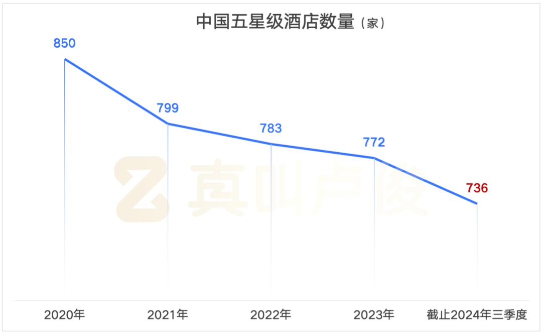 据文化旅游部统计,到2020年,我国有850家五星级酒店,截至2024年第三季度,还有736家五星级酒店。