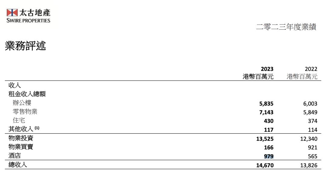 从年报数据可以看出,2023年太古地产酒店收入9.79亿港元(占地240万平方尺),与零售业收入相比,为71.43亿港元(占地910万平方尺)。按每平方尺计算,酒店:每年407.9港元,零售业:每年784.9港元。