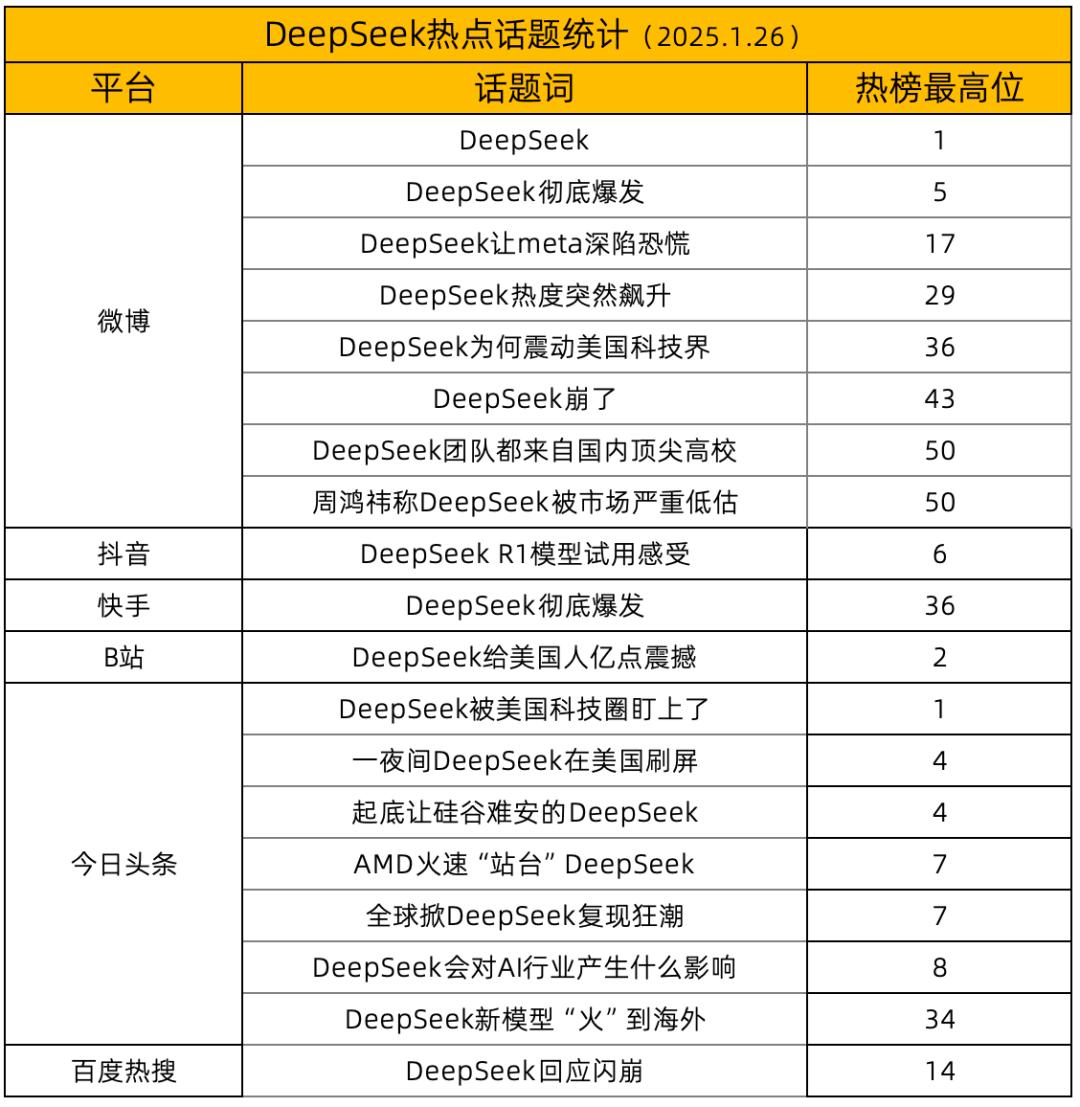据『数字品牌榜』监控,2024年,DeepSeek已经登上知乎热榜,也在哔哩哔哩和小红书上引起了太小的反响,但是品牌声量真的实现了质的变化——开始陆续登上各大社交平台的热榜——2025年1月26日,微博、抖音、快手、哔哩哔哩、今日头条和百度热搜六大平台共产生19个热门话题,各平台的话题词和热榜排名如下: