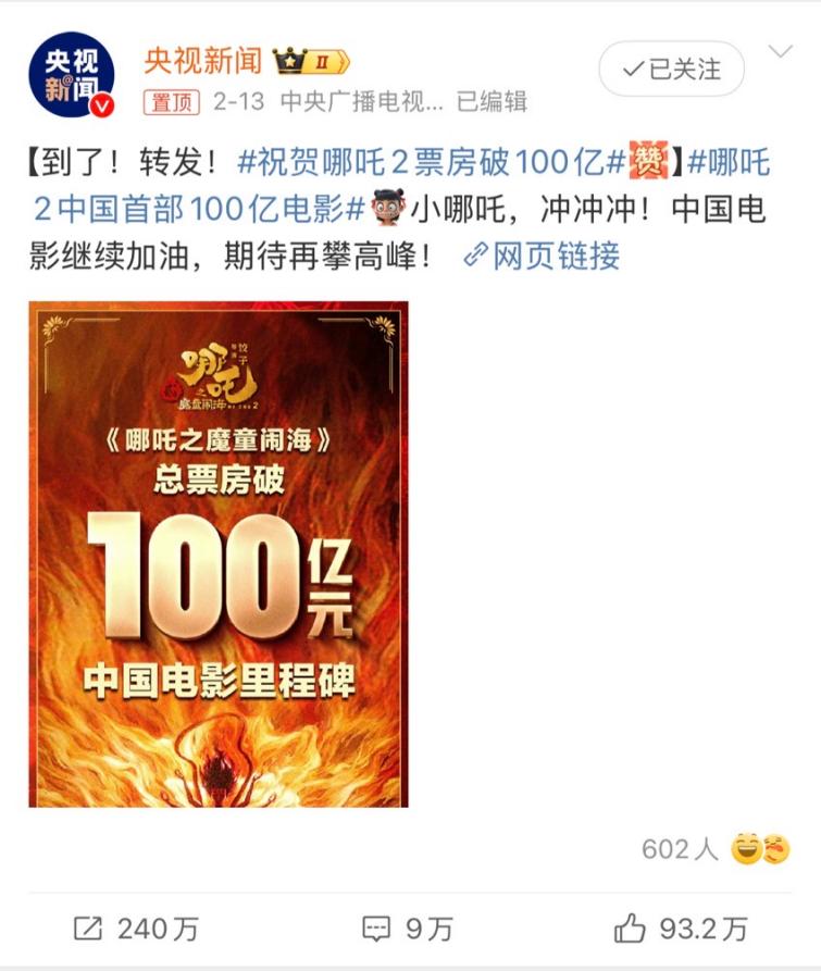 以哪吒2为例,作为中国当地文化创意产业崛起的代表,官民参与“百亿项目”,帮助票房“升国旗”。当《哪吒2》票房突破100亿中国电影里程碑时,@央视新闻第一时间在微博上发布了图文祝贺。之后,很多娱乐导演和艺人分享,呼吁“小哪吒”。题词“哪吒2破100亿”迅速冲上热搜榜第一,在榜单上持续了19个多小时,累计阅读量超过10亿!