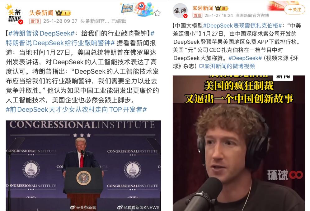 重要性方面,DeepSeek在国外大受欢迎,登上苹果美国免费APP下载榜首,在国外媒体上引起了特朗普、OpenAI创始人、扎克伯格等美国社会名人的看法。信息回到中国,相关话题在微博上热搜。此外,以@央视新闻为代表的官方媒体报道,瞬间激起了公众的民族自信和集体荣誉感,帮助话题在更大范围内破圈。