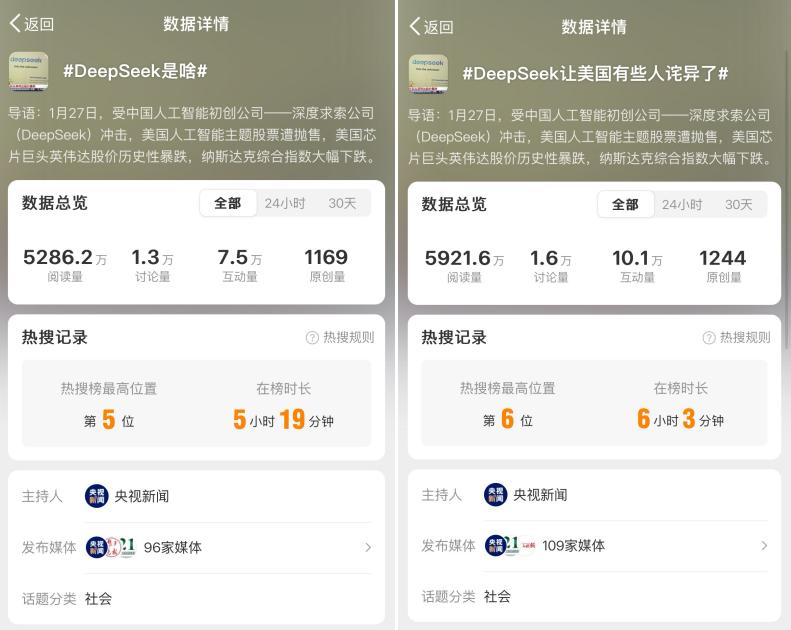 一月二十七日至二十八日,DeepSeek在全网的讨论速度迅速上升,两天之内,仅在微博上就产生了69个热门话题。此后,相关话题在新闻媒体、社交媒体、短视频等平台上不断延伸、发醇,DeepSeek一度成为全体员工关注的焦点。