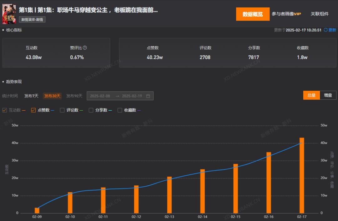 根据制片人“准时工作室”和演员“芝月”的账号数据,截至2月18日下午,5集短剧的总赞数接近100W。