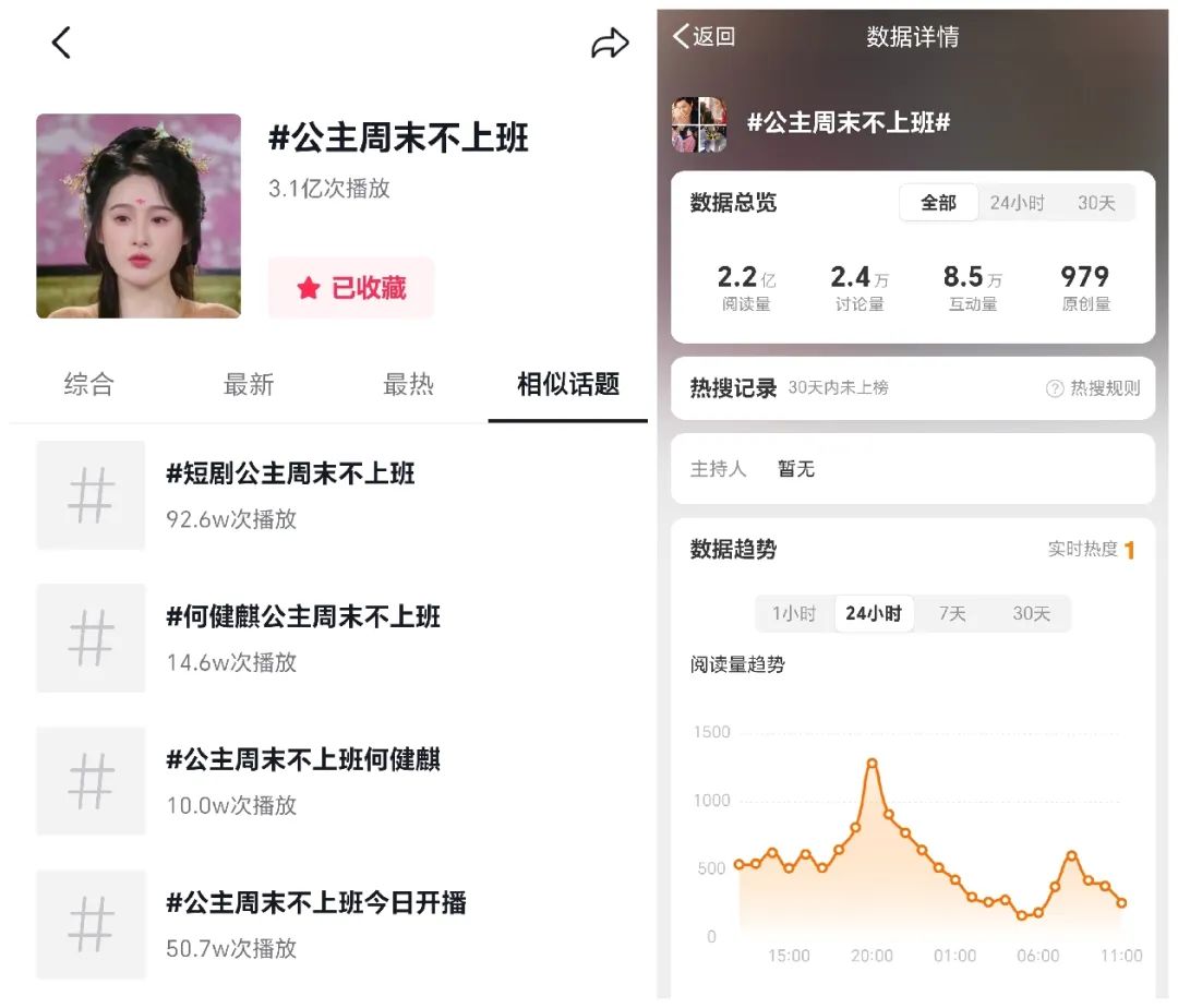 二月八日,抖音平台上一部名为《公主周末不上班》的短剧,只有5集,总共20分钟,上线24小时单集点赞超过10万,2小时内抖音话题热度超过175万。