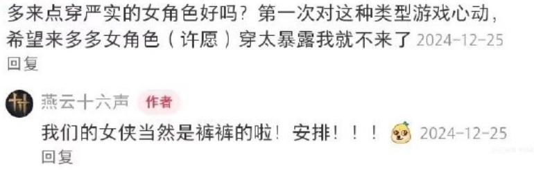 《燕云十六声》作为网易开放世界的武侠游戏,在早期确实打着“女性友好”的幌子。女性角色和剧情都很优秀,宣传的重点更多的是女性玩家。比如开服前,女玩家建议女性角色的衣服要更严格,官方给出了肯定的回答:“我们女人当然是‘裤子’!安排!”