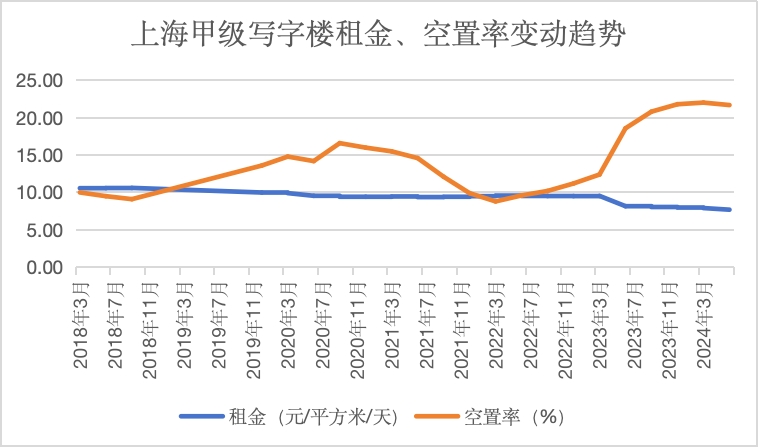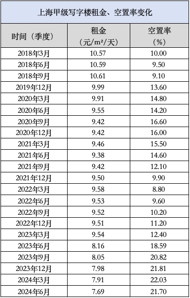 根据同策研究院联席院长宋红卫向36氪提供的数据,根据季度统计,2018年3月底上海高档写字楼租金从10.57元/平方米降至7.69元/平方米/天,空置率从10.00%上升至21.70%。.