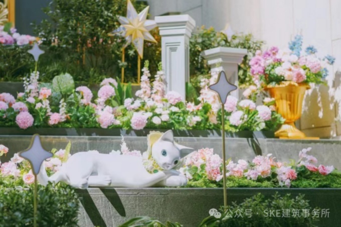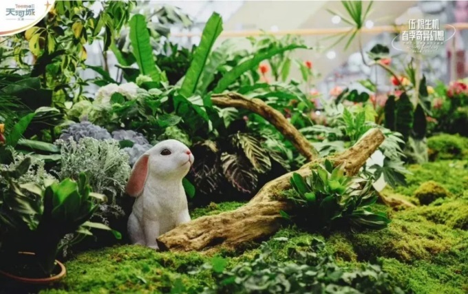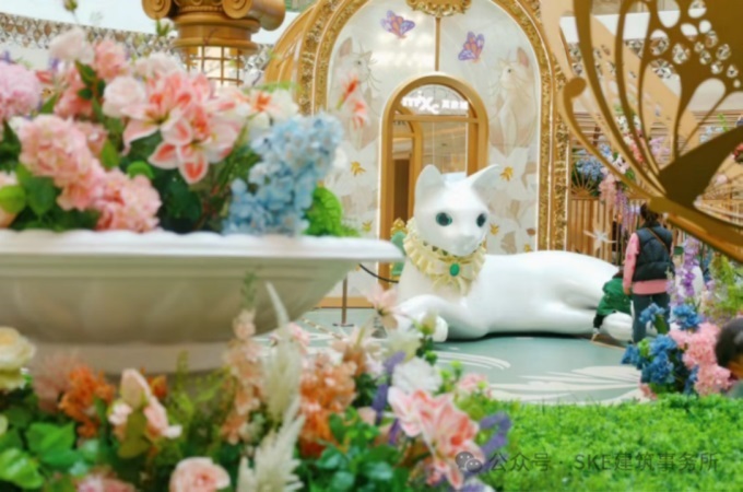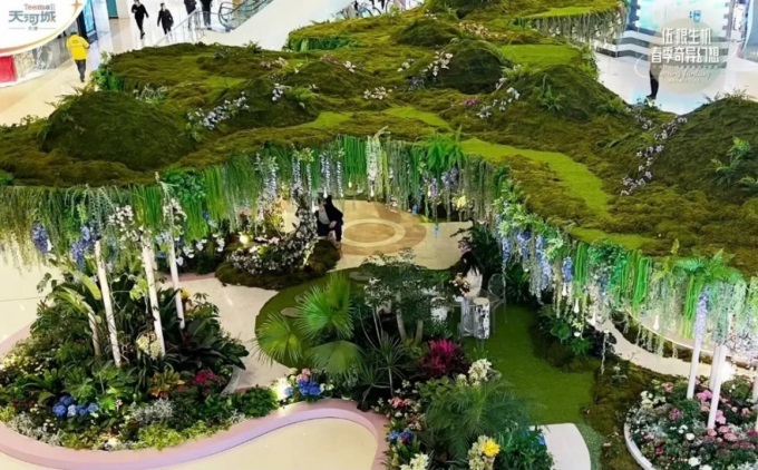 此外,自然元素的突出也是春天美丽的特征之一。春天美丽的核心是展现自然之美,植物、花卉、树木等元素可以直接唤起人们对春天的联想。樱花树、郁金香花海、草原等设计可以让顾客感觉置身于大自然之中。这些一般都是在中厅布置大型花卉设备,窗户设计成花园或森林场景,甚至在地上铺设模拟草坪,增强沉浸感。