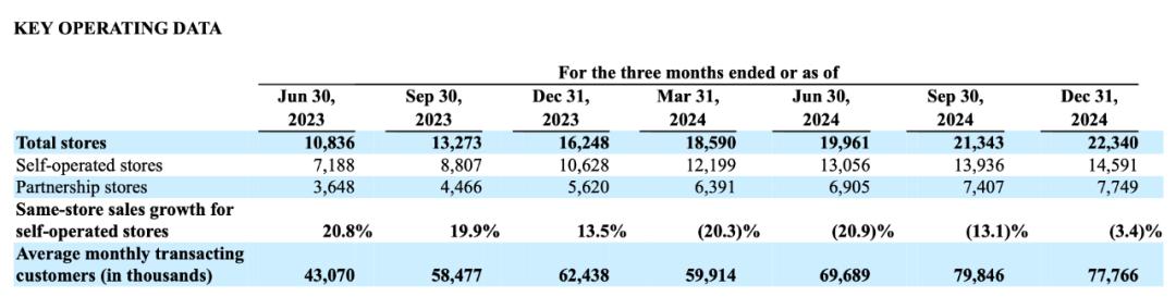 财务报告中的亮点数据包括但不限于2024年净收入同比增长38.4%至345亿元,月交易客户同比增长48.5%至7180万。过去一年,新开了6092家门店,门店总数增长37.5%至22340家。