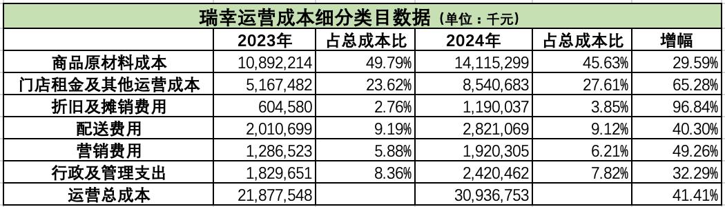 与此同时,瑞幸2024年门店租金及其它运营费用同比增长65.3%至85亿元,营销费用增长49.3%至19亿元,配送费用增长40.3%至28亿元,折旧及摊销费用增长近11.9亿元。