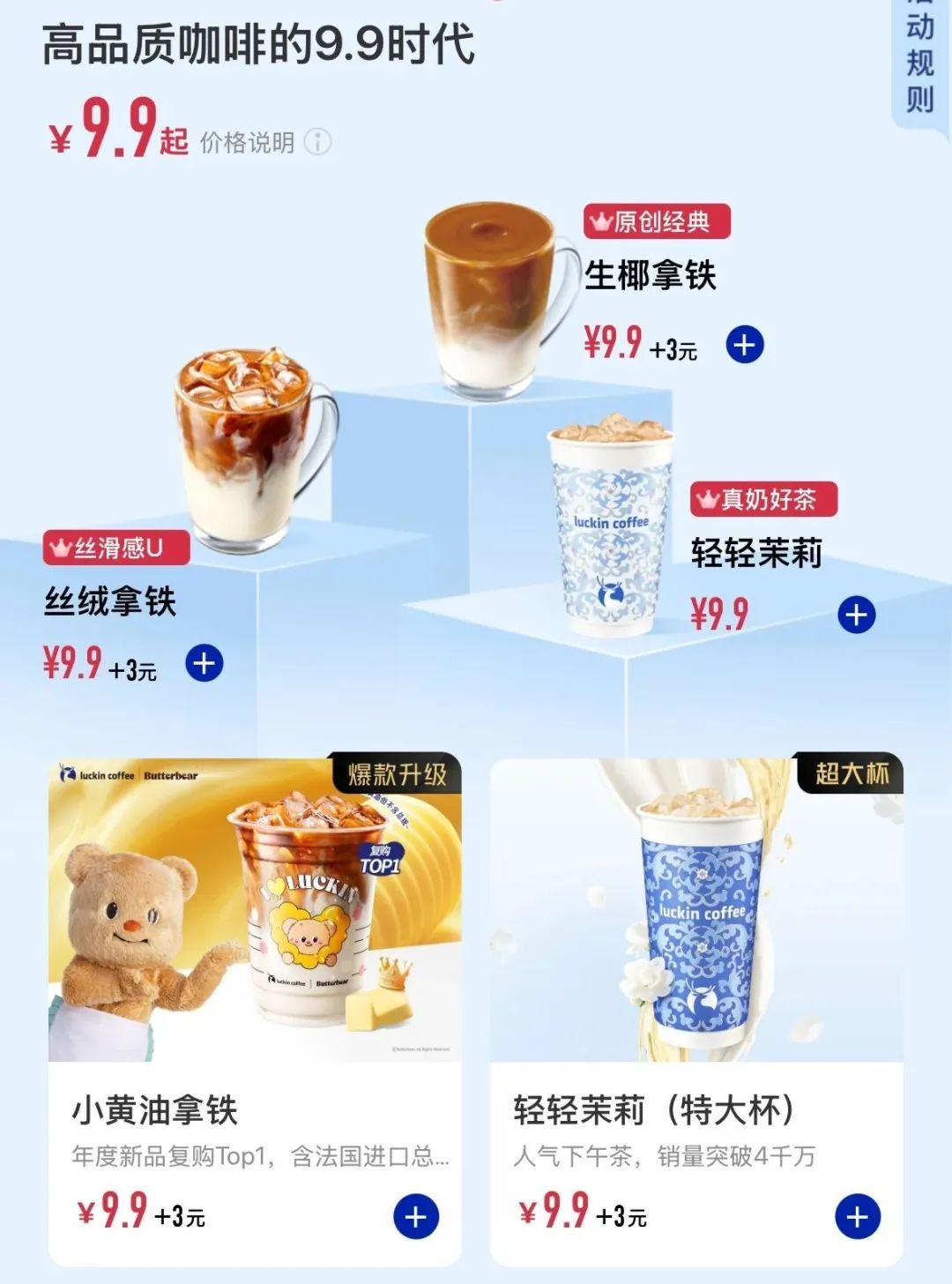 比如虽然还保留了9.9元的区域,但真正能用9.9元买到的咖啡,似乎只有标准的美式、拿铁、燕麦拿铁。此外,过去几年的爆款产品,如生椰拿铁、天鹅绒拿铁、小黄油拿铁等,都悄悄加了3元钱。