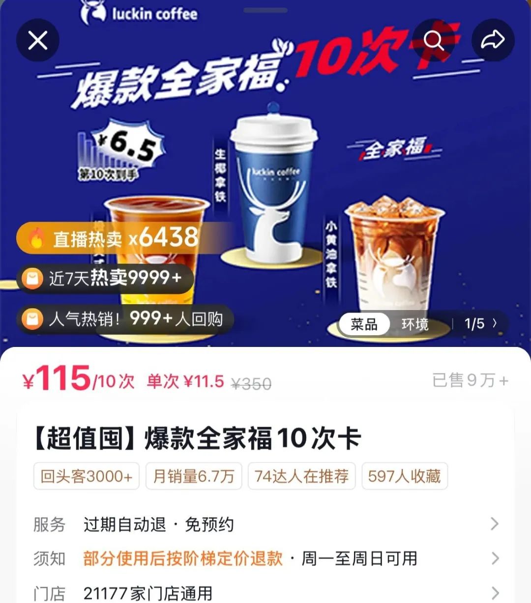 除标志性的一杯咖啡9元9元外,工人们熟悉的瑞幸抖音99元/10卡,也曾是性价比的象征。