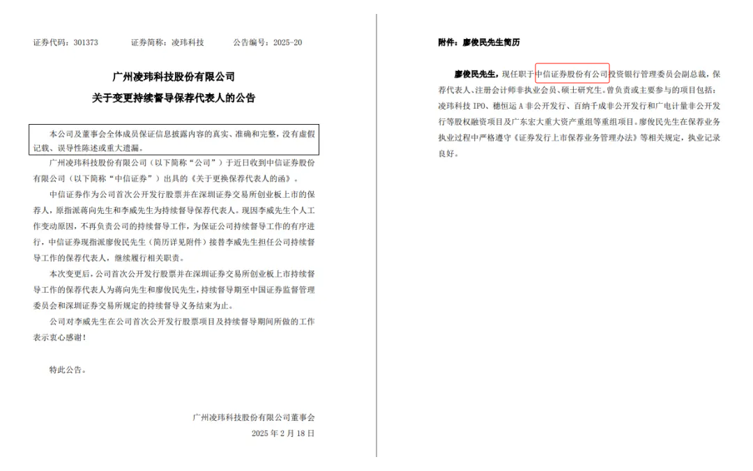广州凌玮科技有限公司(以下简称凌玮科技)公告注明,中信证券是公司创业板首次上市的保荐机构,原指派蒋向先生和李威先生担任持续监督保荐代表。由于李威先生的个人工作变动,现在不再负责公司的持续监督。中信证券现指派廖俊民先生(简历详见附件)接任李威先生担任公司持续监管的保荐代表人,继续履行相关职责,以确保公司持续监管工作的有序开展。