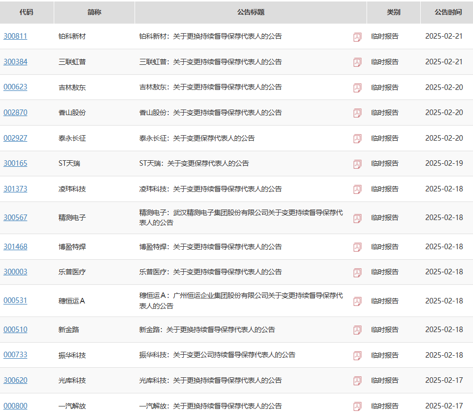 由于种种原因,上市公司变更了保荐代表人,公告数量相当多。春节后开市仅13个交易日,上海证券交易所已有19条变更保荐代表人的通知;深圳证券交易所有26个,其中2月18日有7个。
