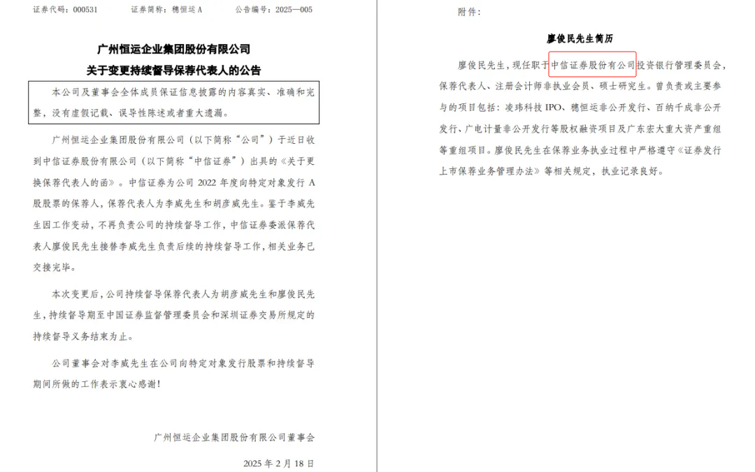 根据广州恒运集团有限公司(以下简称穗恒运A)的通知,中信证券是2022年向特定对象发行a股的保荐人,保荐代表为李威先生和胡彦威先生。鉴于李威先生因工作变动不再负责公司的持续监管,中信证券委派保荐代表人廖俊民先生接任李威先生负责后续的持续监管,相关业务已交接。
