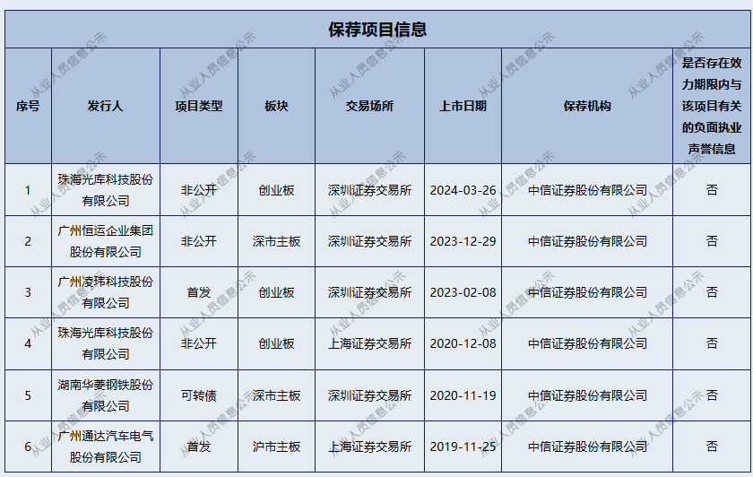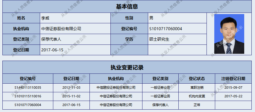 一周后,两家上市公司似乎没有意识到公告中的“错误”。在中信证券方面,从业岗位变更或辞职注销流程尚未完成。目前,李威仍出现在中信证券保荐代表名单上。