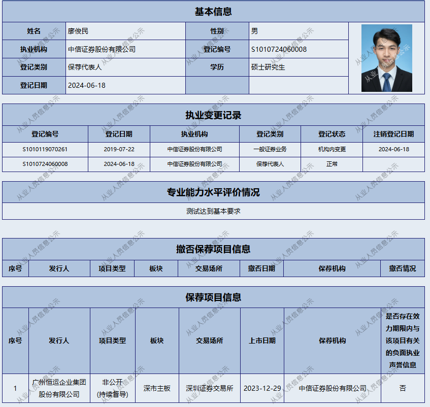 接任其职务的廖俊民资历浅薄:2019年7月首次登记,2024年6月刚刚成为保险代理。除了这个项目,之前没有签单信息。作为一个保险新手,我一开始就要承担两个主要的监管项目,这反映了中信证券保险代理团队的新旧交替压力。