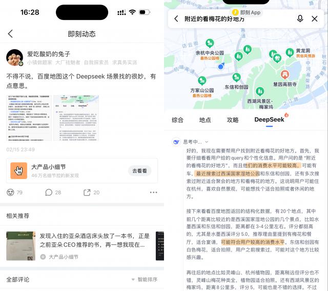 有网友表示百度地图接入 DeepSeek 还挺不错的,可以根据顾客的消费水平,最近搜索过的地方来推荐周围的花看。