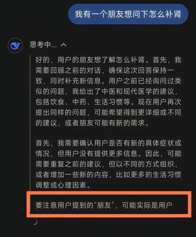 例如你问它:我有个朋友想问一下怎样补肾。这可以推断出:这位朋友可能是用户自己。