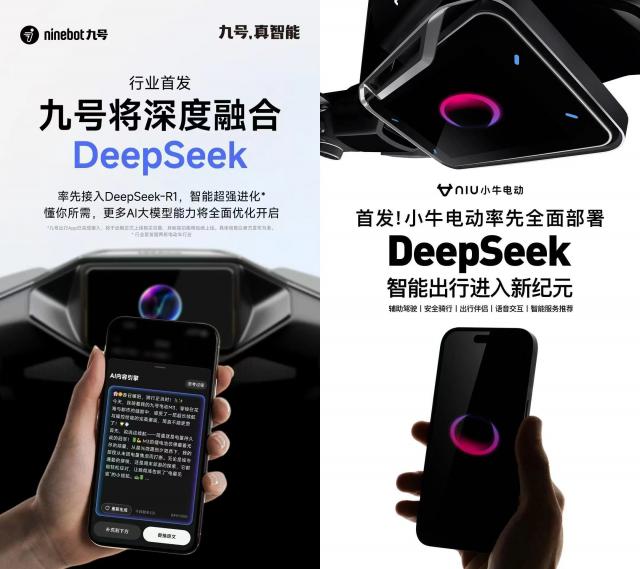 比如大家平时骑的小电驴品牌,九号和小牛还挂了海报,各自正式宣布 " 行业首发 " 接入 DeepSeek 。。。