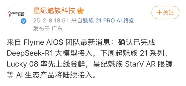 2 月 8 日,荣耀宣布上线 DeepSeek-R1 品尝新鲜版;同一天,OPPO 也宣布 OPPO Find N5 将接入 DeepSeek-R1 ;或者是同一天,魅族Flyme AIOS 这个团队也已经完成 DeepSeek-R1 大型接入模型。。。