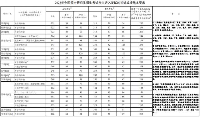 2 月 24 日,教育部发布了《2025》 全国硕士研究生招生考试考生复试初试成绩基本要求(国家分数线)。根据《2025》,各招生单位 《全国研究生招生管理条例》在国家分数线的基础上,自主确定并公布报考本单位的考生进入复试的初试成绩和其他学术要求。
