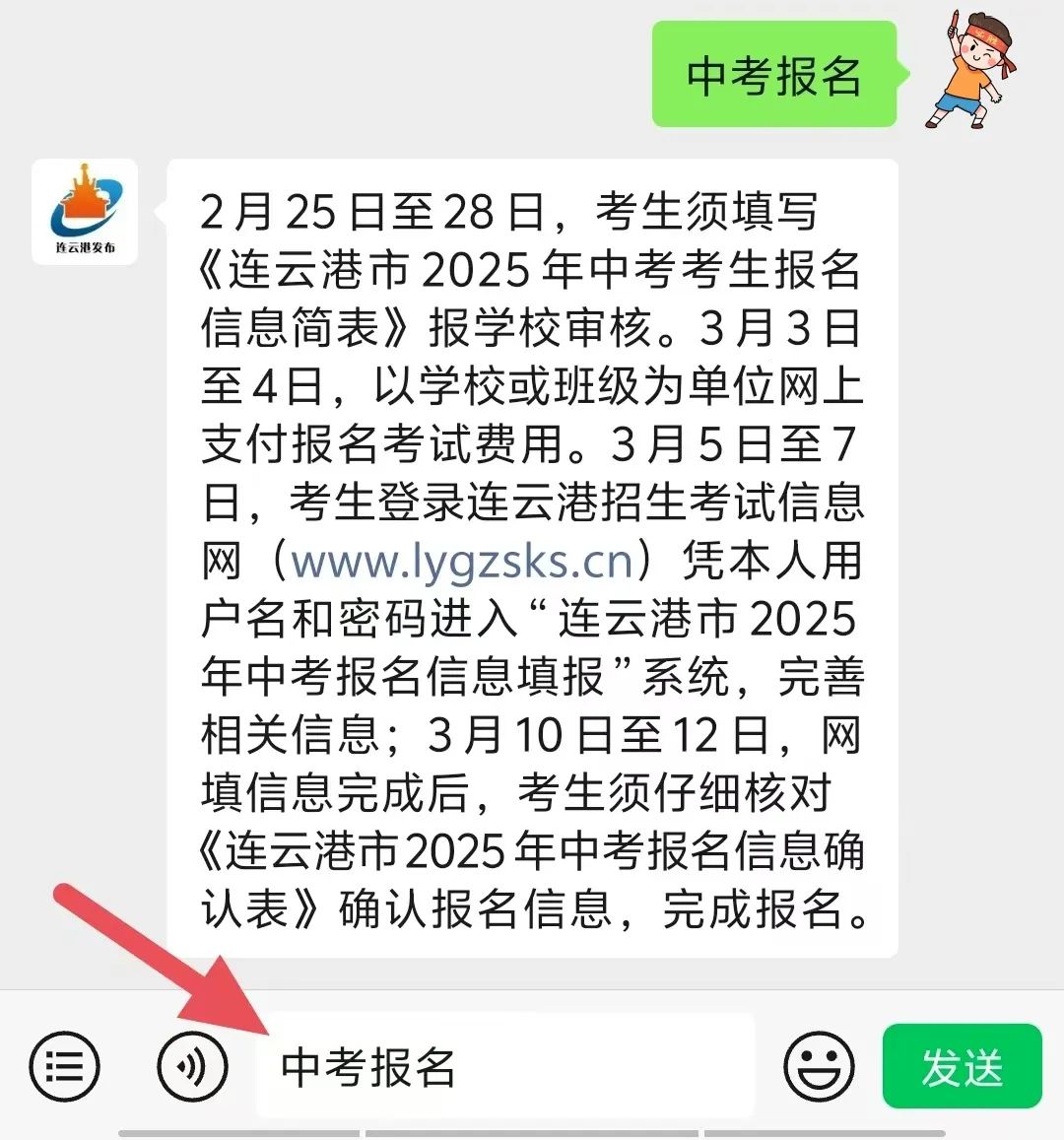 2、进入『连云港发布』微信公众号首页,在对话框回复关键字“中考报名”;