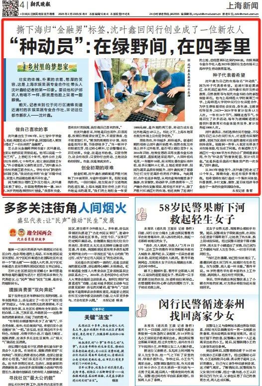 2月23日,《新民晚报》第四版头条关注《撕下海归“金融男”标签,沈叶鑫回闵行创业成为新农民》。详情请参考。↓