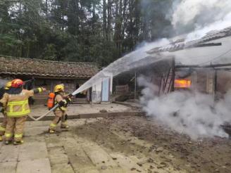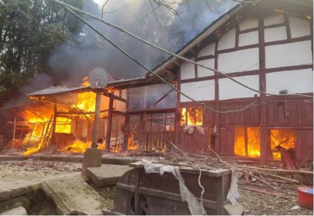 普光队到达现场时,木屋处于强烈燃烧状态,木门窗被火焰吞噬。横梁断裂和燃烧爆裂的声音不断传来,高温热浪逼人。