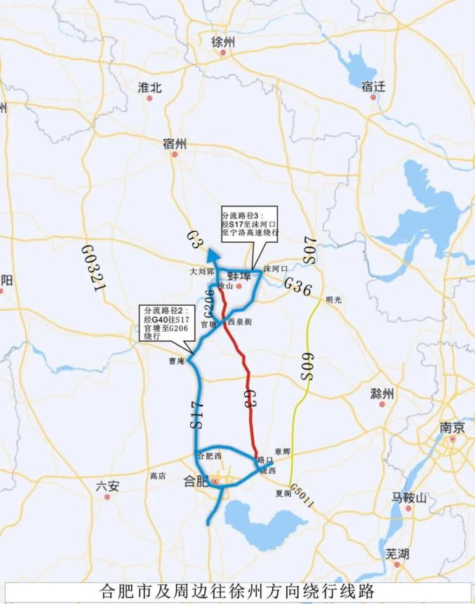 安庆、六安优先选择G0321德上高速绕道至蚌埠、徐州,或通过合肥绕城由S17蚌合高速绕道至官塘或刘府高速绕道至涂山高速通道,或选择凤阳连接线绕道。