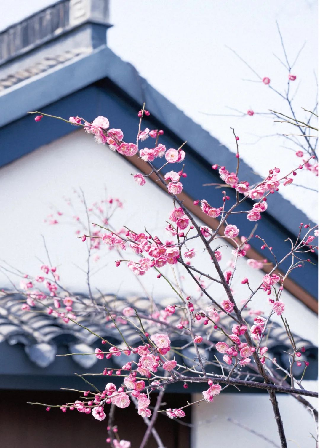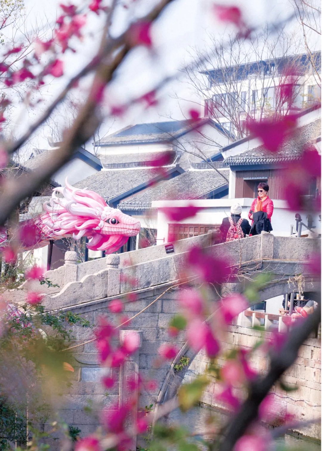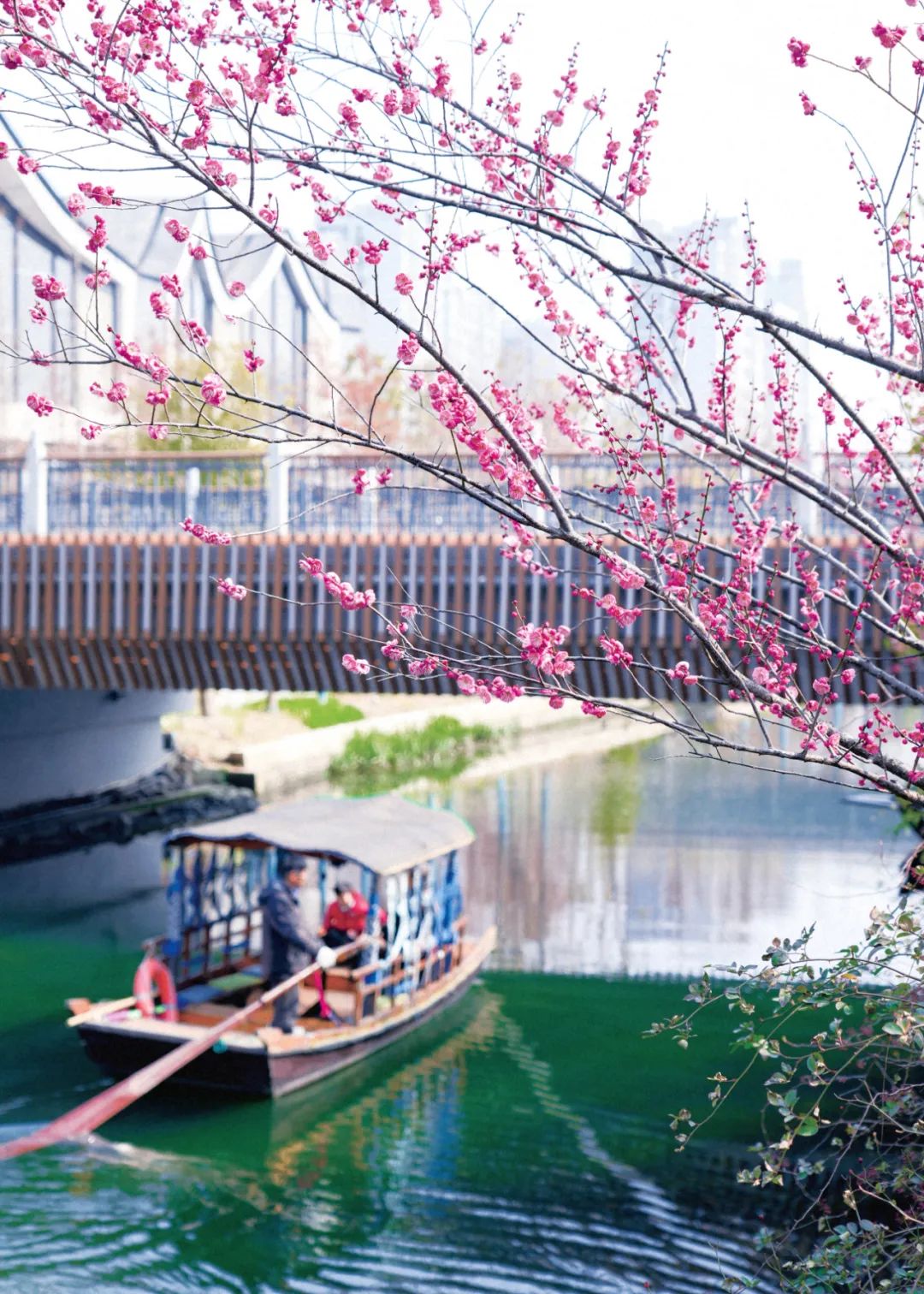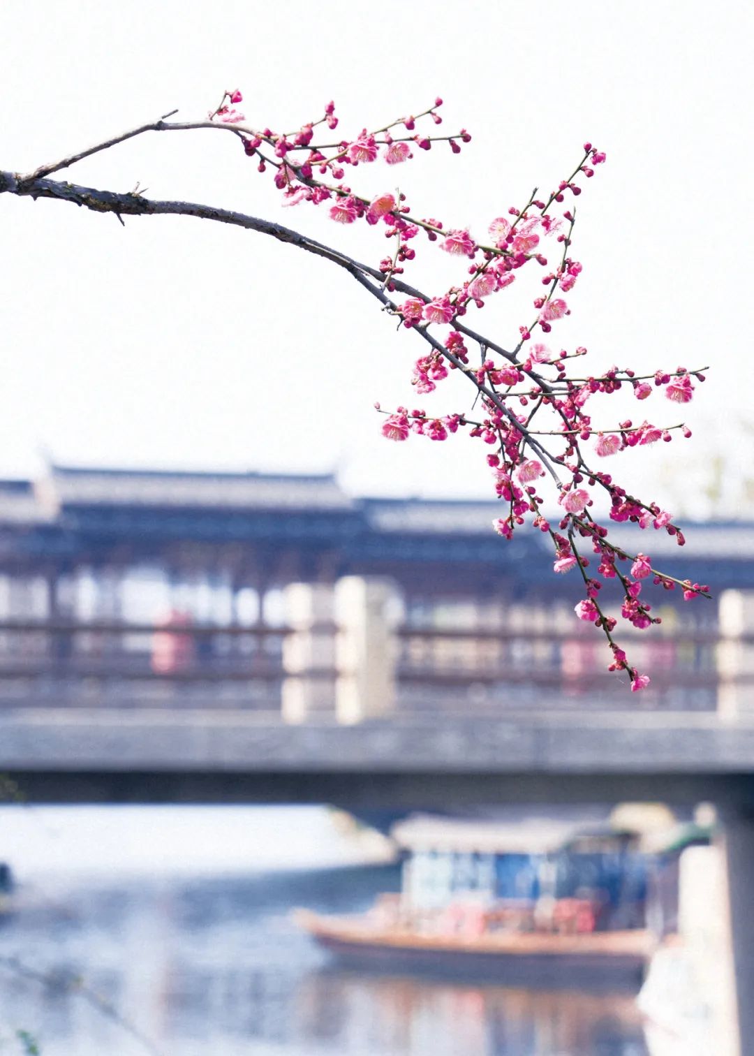 小桥流水潺潺,桥洞下摇曳的客船缓缓驶来,红梅在飞檐翘角间竞放,虚实交错,光影交错,成为江南春天最动人的风景。