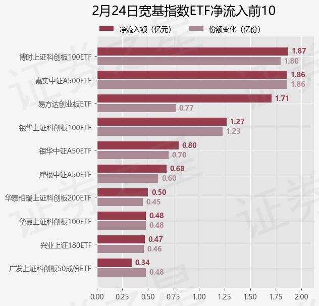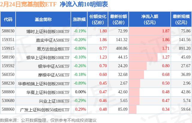 当天有 19 只宽基指数 ETF 资金净流入显示,其中博时上证科技创新板净流入排名第一。 100ETF(588030)增加了份额 1.8 十亿份,净流入额为 1.87 亿元。