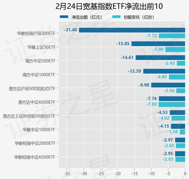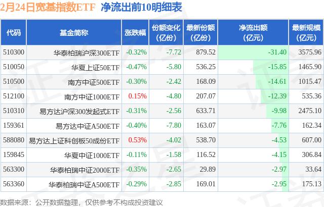 当天有 157 只宽基指数 ETF 资金出现净流出,其中华泰柏瑞沪深深排名第一。 300ETF(510300)减少了份额 7.72 一亿份,净流出额为 31.4 亿元。