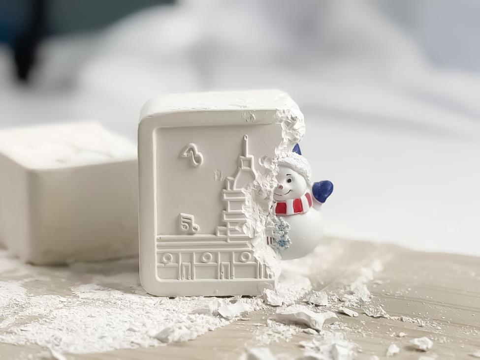 告别游客和市民后,大雪人将继续以另一种形式生活——文化创意盲盒。你可以亲自从石膏里“挖”出历代雪人的微缩模型,隐藏的钱是2019年初的雪人。