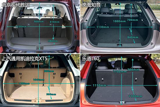 在后备箱方面,四款车的后备箱平整;岚图知音和乐道两款纯电动车型 L60 打开平台后,底部还有一个私密的储物空间。上汽通用凯迪拉克 XT5 储物格设置在后备箱两侧,可以放置一些小物品。我们测量了四款车后备箱的实际载货能力,上汽通用凯迪拉克 XT5 四项数据均超过同级别车型的平均检测值,整体性能优于其它三款车型。