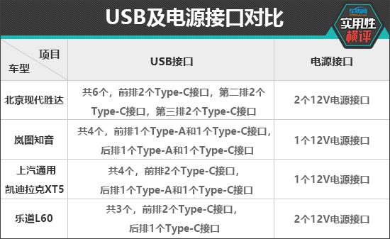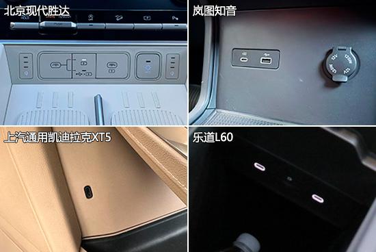 在充电插座方面,北京现代胜达在数量上优于其他三款车型,整车共配置。 6 个 USB 接口,但类型单一。岚图知音提供了两种类型的接口,可以更好地满足乘客的日常充电需求,尽管接口数量不如北京现代盛达。北京现代盛达和乐道 L60 配置 2 个 12V 电源接口,能满足日常生活的需要。