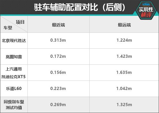 在驻车辅助配置方面,北京现代胜达在前方驻车雷达检测中的检测能力最强,最远的检测距离达到 1.221m。乐道持续蜂鸣阶段 L60 性能优于其它三款车型,测试结果接近同级别车型的平均测试值。
