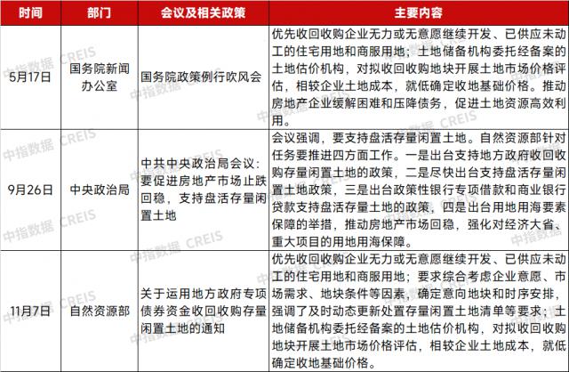 2024 年 11 月 7 当天,自然资源部发布关于收购闲置存量的通知,指出要积极利用地方政府专项债券资金,增加收购闲置存量的力度。明确收地范围,除了公司无力或不愿意继续开发、供应未开工的居住用地和商业服务用地以外的其他用途土地外,进入司法或破产拍卖、出售程序的土地,以及因低效土地再开发或基础设施建设而需要收回的土地,以及在已开工地块中规划可分割未建设的部分,也可纳入收回收购范围。