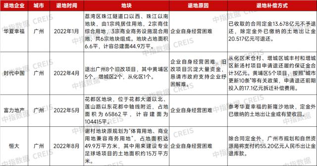 另外,一些企业自身经营不善,无法承担后续开发投资,退地的主要作用是减轻负债、现金流紧张的压力。比如时代中国退回广州 8 广州白鹅潭华夏幸福归还地块 CBD 地块、R&F地产退还广州花都区地块等。这些地块退还地块后,房地产企业不需要继续投入相应地块的开发资金,还可以收回部分土地出让金,缓解企业的经济压力,但仍面临保证金等前期资金的损失。