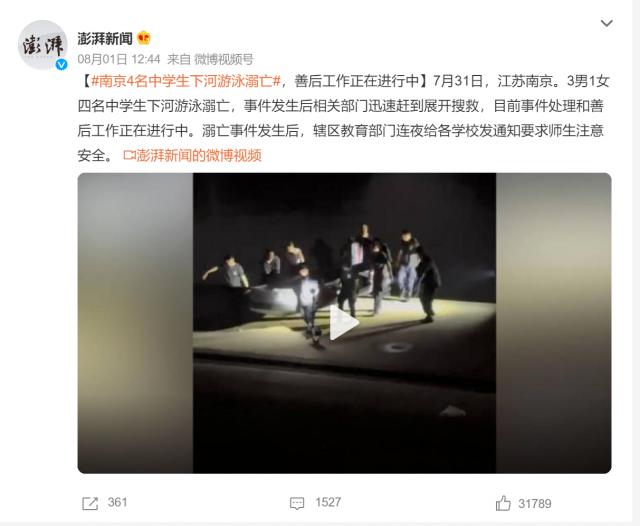 此前发生了一起不幸:南京 4 下河游泳溺水名中学生: