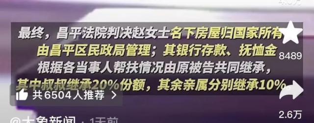 不幸的是,昌平法院的最终判决让这些叔叔阿姨的百万遗产计划失败了。赵女士名下的房子归国家所有,她的银行存款和抚恤金由叔叔阿姨根据各方的支持情况继承。