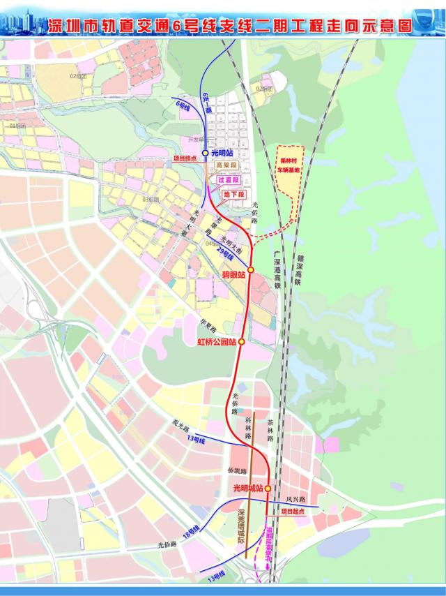 6 在光明区内敷设号线支线二期工程,起源于光明区。 6 号线支线一期工程 � � 光明站(原翠湖站),终至 � � 光明城站,线路全长约 4.944 km,共设 3 网站:碧眼站,虹桥公园站,光明城站。