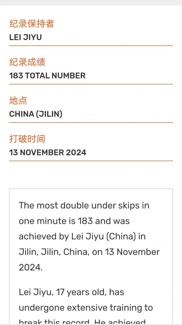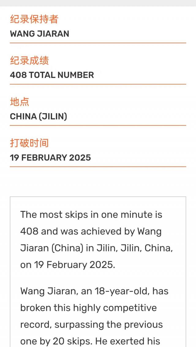 近日,来自吉林的两个人 17 年长的高中生王嘉然和雷济宇,各自刷新了吉尼斯世界纪录的两次跳绳,成为全新的纪录保持者。王嘉然将" 1 每分钟单摇跳绳的频率最高"世界纪录推至 408 第二个新高度;而雷济宇成功刷新的“ 1 双摇跳绳每分钟最多频率的记录 178 次提升到 183 次。这两项记录的前任记录保持者也是来自中国的选手。在中国跳绳运动中,王嘉然和雷济宇的成功再次注入了新的活力。